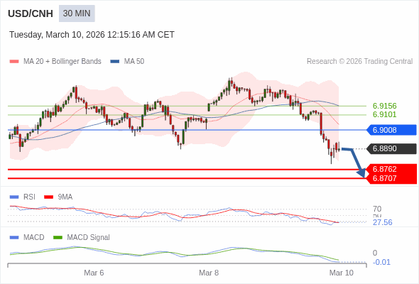 技术点评: RSI技术指标小于30。在这种情况下,说明有很强的下跌趋势,或者意味着处在超卖的状态下,可能会有向上的反弹。我们将观察RSI技术指标是否出现背离现象。 MACD技术指标处在其信号线之下看空。 配置为负。 此外,价位低于其20天及50天移动平均线 ( 分别位于6.9041 和6.9158 )。