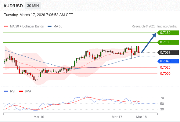在 0.7040 之上,看涨,目标价位为 0.7100 ,然后为 0.7130 。