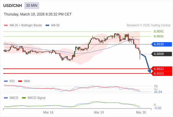 技术点评: RSI技术指标小于30。在这种情况下,说明有很强的下跌趋势,或者意味着处在超卖的状态下,可能会有向上的反弹。我们将观察RSI技术指标是否出现背离现象。 MACD技术指标处在其信号线之下看空。 配置为负。 此外,价位低于其20天及50天移动平均线 ( 分别位于6.8960 和6.8988 )。 最后,价位跌破其布林线通道下轨 (位于6.8825。