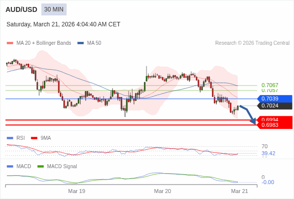 澳元/美元 当日内 : 看跌,在 0.7039 之下。
