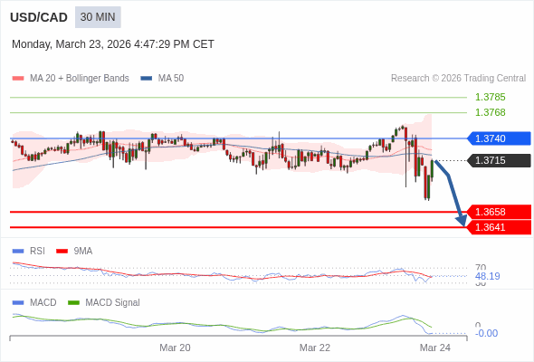 美元/加元 当日内 : 看跌,在 1.3740 之下。
