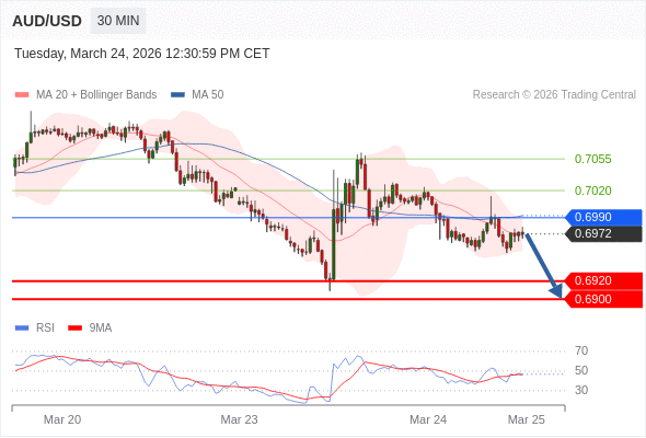 交易策略: 在 0.6990 之下,看跌,目标价位为 0.6920 ,然后为 0.6900 。
