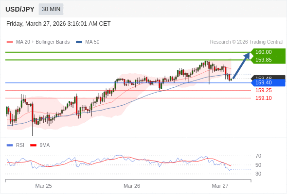 在 159.40 之上,看涨,目标价位为 159.85 ,然后为 160.00 。