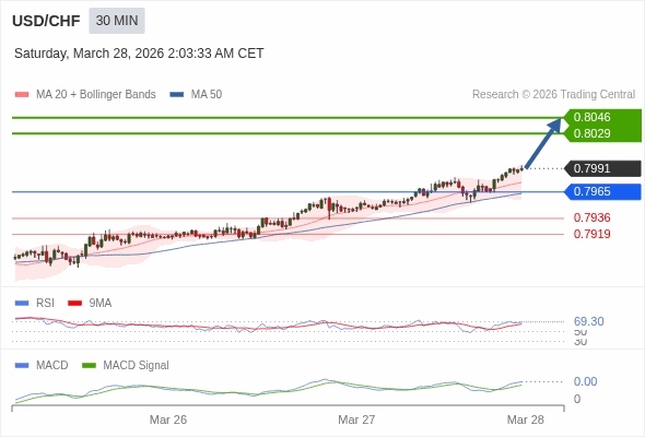 美元/瑞郎 当日内 : 看涨,当 0.7965 为支撑位。
