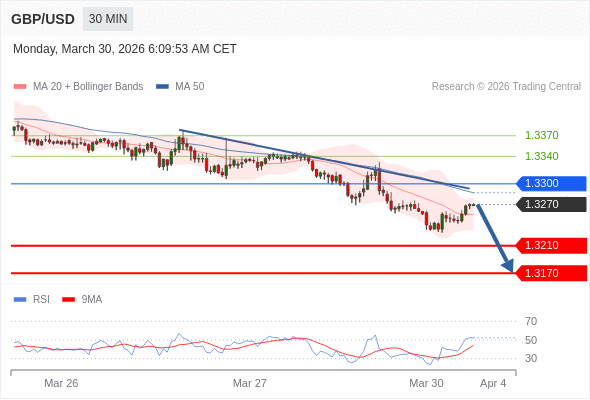 交易策略: 在 1.3300 之下,看跌,目标价位为 1.3210 ,然后为 1.3170 。