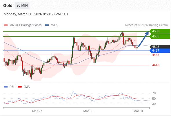 在 4487 之上,看涨,目标价位为 4555 ,然后为 4580 。