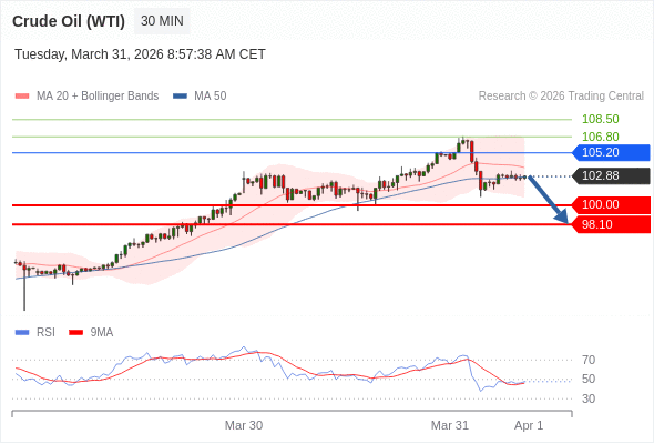 在 105.20 之下,看跌,目标价位为 100.00 ,然后为 98.10 。