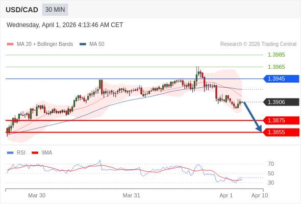 交易策略: 在 1.3945 之下,看跌,目标价位为 1.3875 ,然后为 1.3855 。