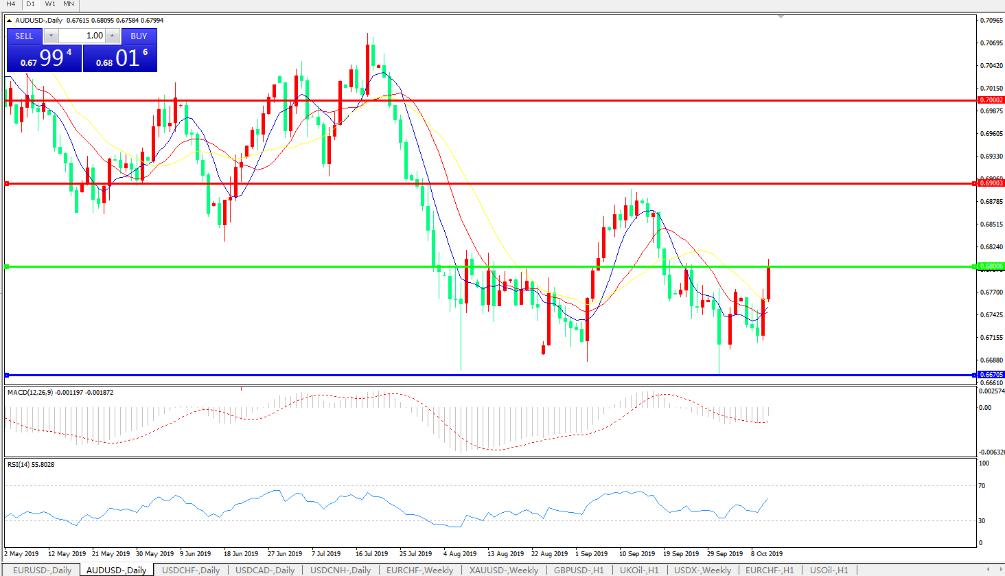 澳元兑美元在周五亚洲时段延续涨势,日内升至0.6787这一自925日以来的两周半新高,因隔夜以来全球消息面的人状况全面向好。一方面,投资者对全球贸易环境在此前取得突破性进展寄予厚望,另一方面,英国脱欧协议前景有望峰回路转,则进一步提振了市场信心;作为对贸易相关情绪高度敏感的商品系货币,澳元近期以来即随着贸易情绪的反复而持续波动,并在确信的乐观消息下终于突破前期盘整区间。市场因而正在等待进一步后继消息的出炉,在周末来临前保持谨慎看涨态度;技术上看,澳元兑美元短线面临0.6800-10的趋势阻力位,升破之后将上看9月份的高点0.6895,从而完成中期双底的构筑。但如果消息面再度急转直下,那么周二和上周五的阶段高点0.6775将是首要支撑,失守后将瞎看10日均线0.6741的支撑,之后若进一步跌破0.67关口,则表明反弹的夭折和跌势的重启