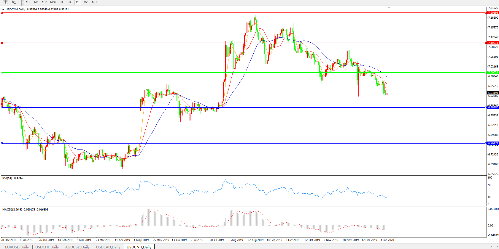 交易策略: 在7.0000之下,看跌,目标价位为6.8820,然后为6.7600。