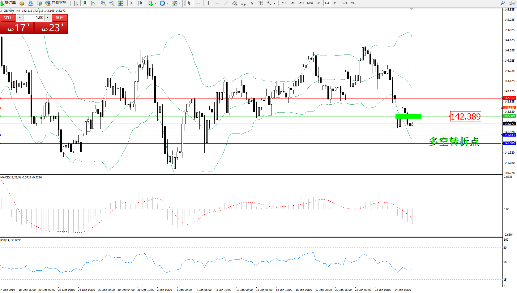 交易策略:142.389下方看跌,目标141.833141.589