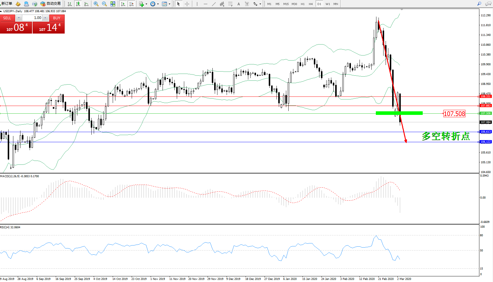 交易策略:107.508下方看跌,目标106.613、106.122
