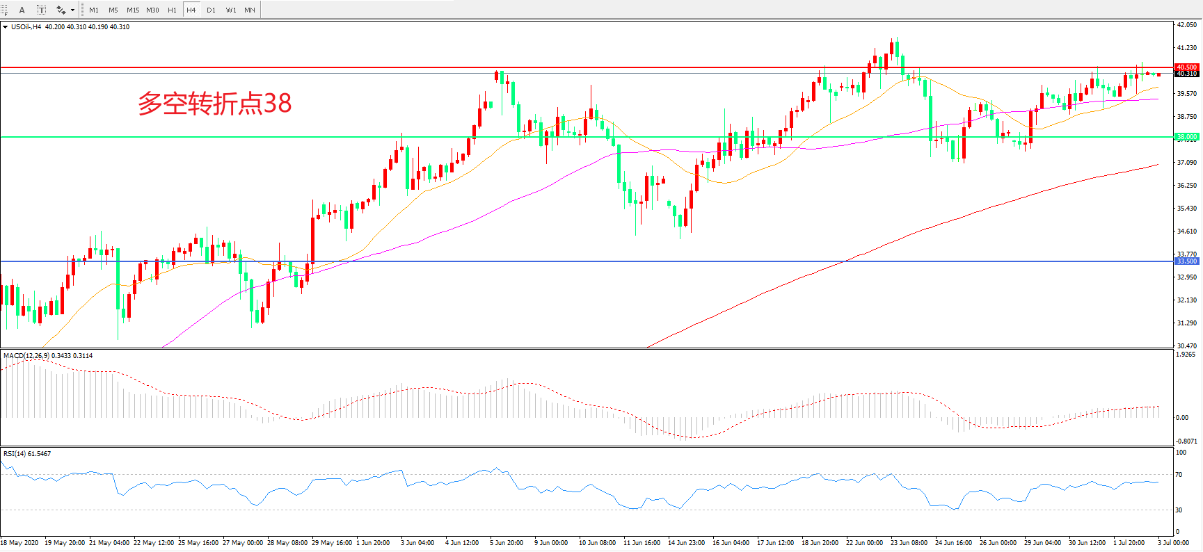 4小时图看,油价延续高位震荡,整体波幅不大,55周期均线成为短期支撑,40.50成为短期阻力,MACD红柱增加,RSI指标走平,日内延续震荡概率较大。