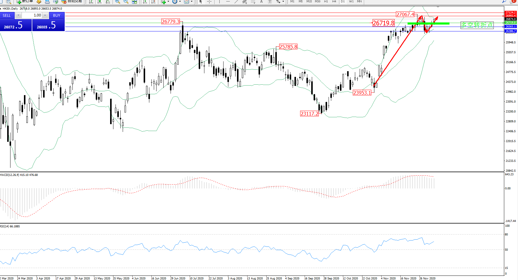 技术点评:多头动力延续布林带指标中上轨区间持续震荡上扬后,高位抵达27067位置遇阻开始震荡下行,触及布林带指标中轨附近节点后开始窄幅整理,高位空头动力短暂回撤后开始整理有继续回升迹象,布林带指标呈收口走势中,MACD指标处于多头区域高位持续整理平移后有下行迹象,RSI指标处于多头区域高位持续整理下移后徘徊;