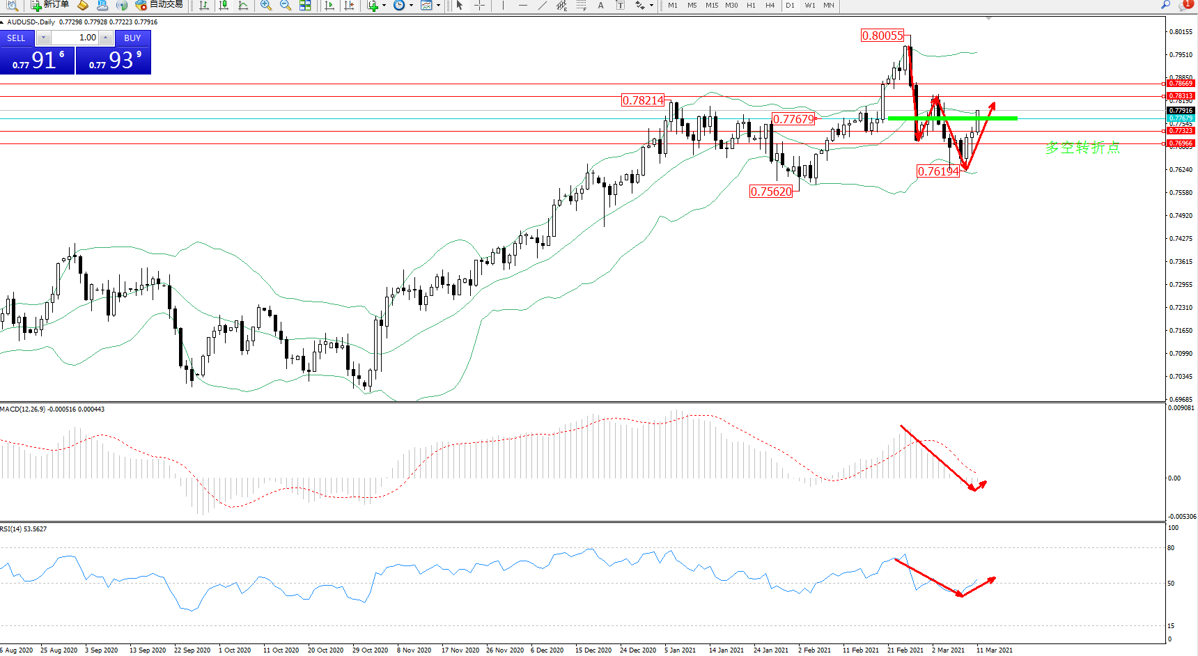 备选策略:0.77679下方看跌,目标0.77323、0.76966