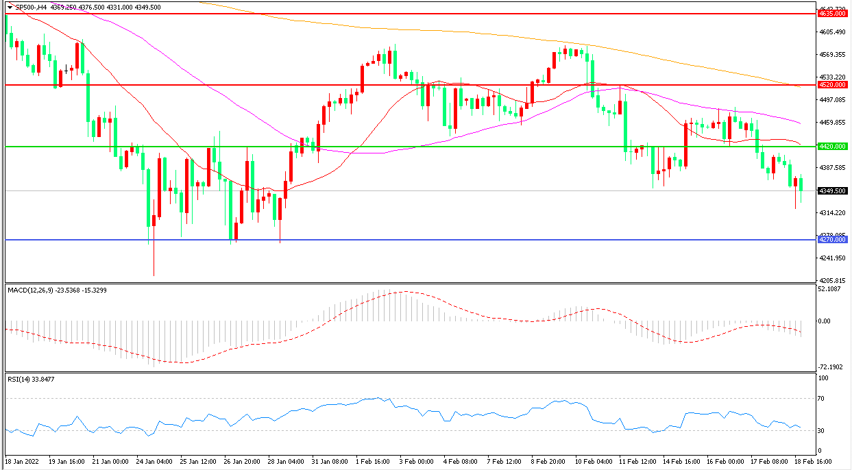 上周五(2月18日),从地缘政治到美联储强硬立场,投资者不断受到各种因素的打击,标普500震荡下行,收报4349.50点。目前乌克兰东部的暴力冲突升级仍然令美股承压,如果美俄双方继续对此争执不下,美股可能仍然延续下行走势。