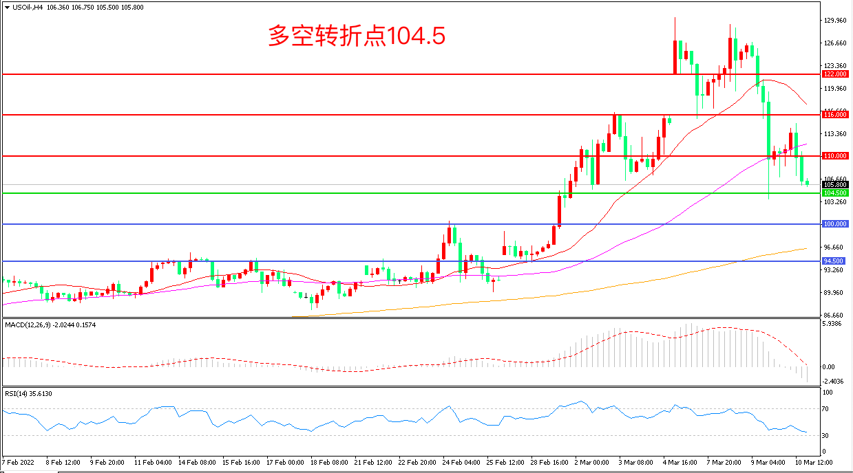 周四(3月10日),俄乌停火问题没有取得进展,但伊核谈判始终对油价形成威胁,美国WTI原油短线冲高后再度下挫,收报105.80美元/桶。目前市场交易已不是原油基本面本身的因素,而是战争的局势是否扩大、制裁是否扩大,重点关注后续俄乌冲突与伊核谈判的进展。