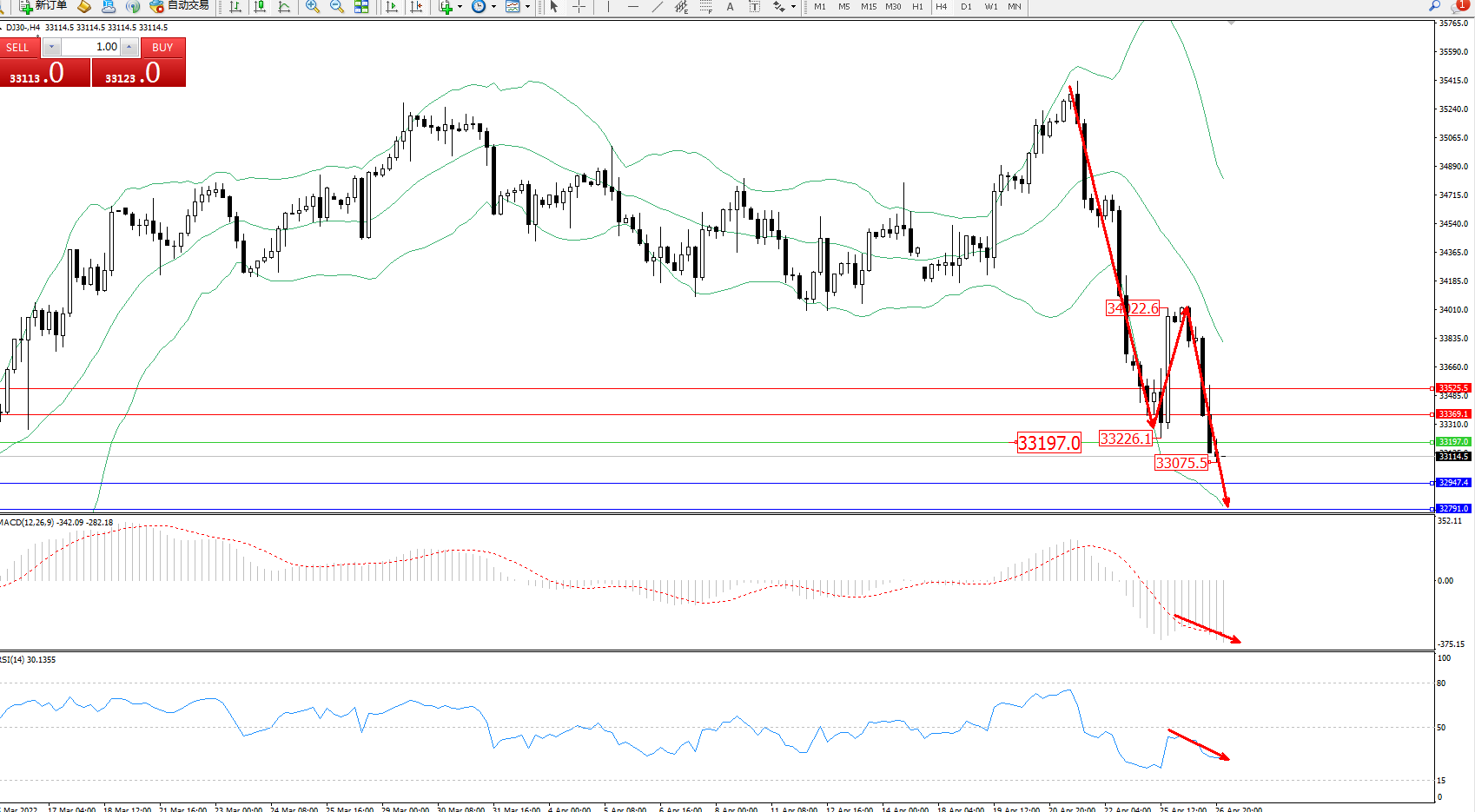 道琼斯指数DJ30——4小时K线图显示: