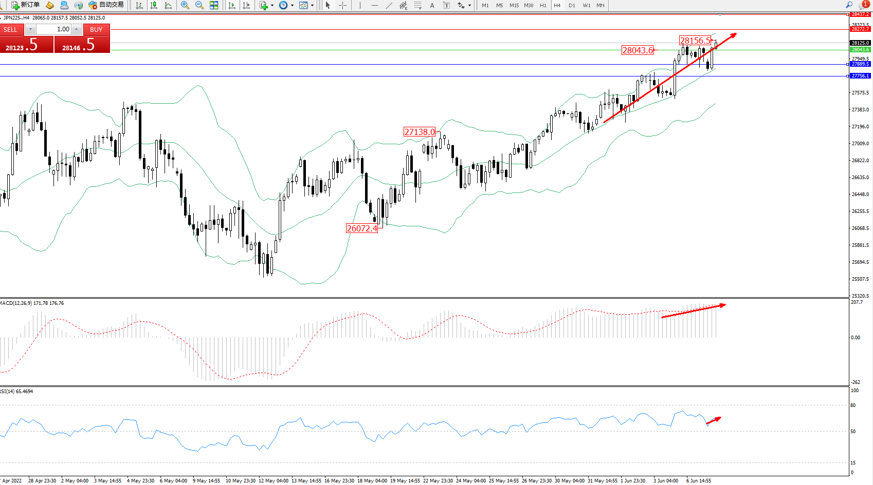 日经指数JPN225——4小时K线图显示: