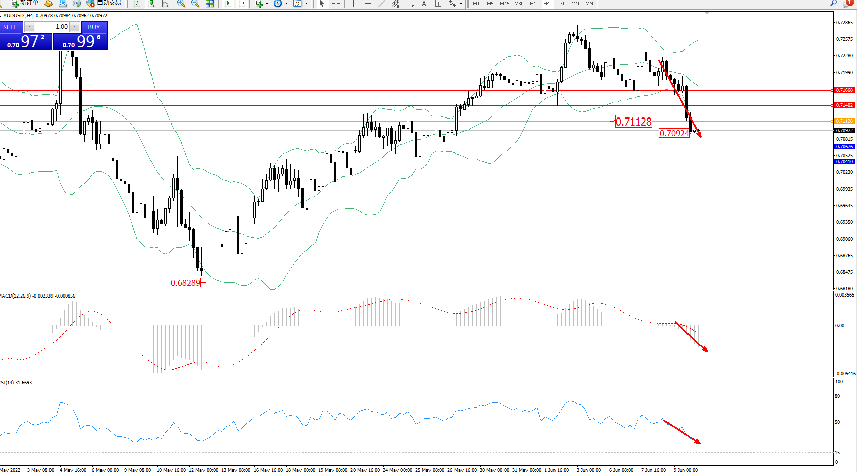 交易策略:0.71128下方看跌,目标0.70676、0.70410