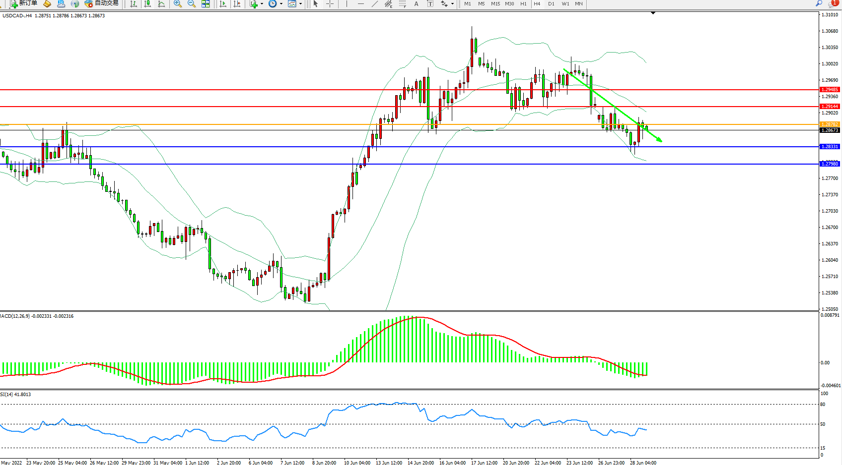 4小时图看:空头动力延续布林底部真通道中下轨区间持续震荡下行,低位短期反转上移后再度下行,市场空头情绪笼罩,布林带指标呈张口走势后开始收口,,MACD指标处于0轴线下方弱势整理,RSI指标处于50均衡线下侧徘徊中;