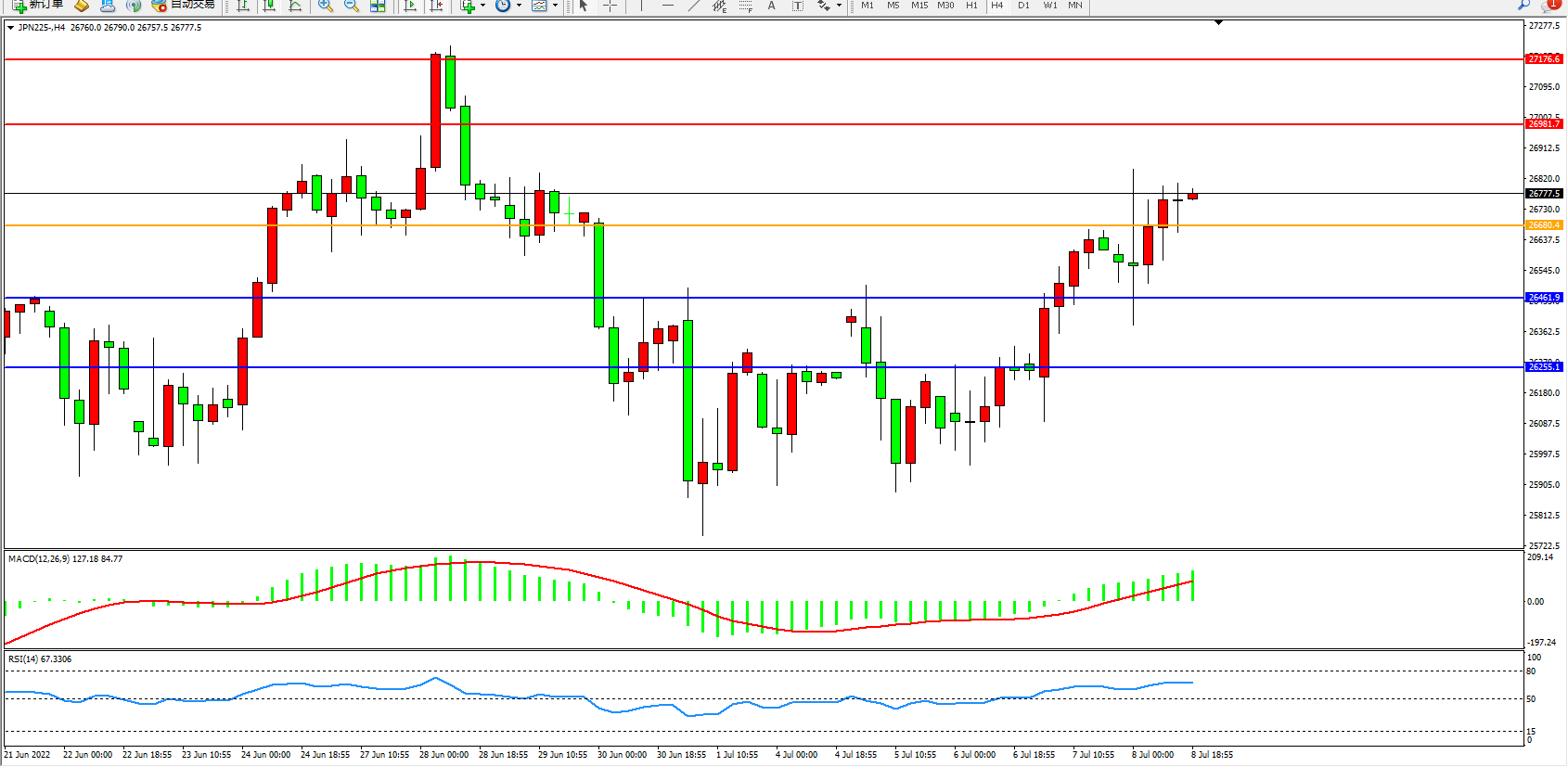 日经指数JPN225——4小时K线图显示: