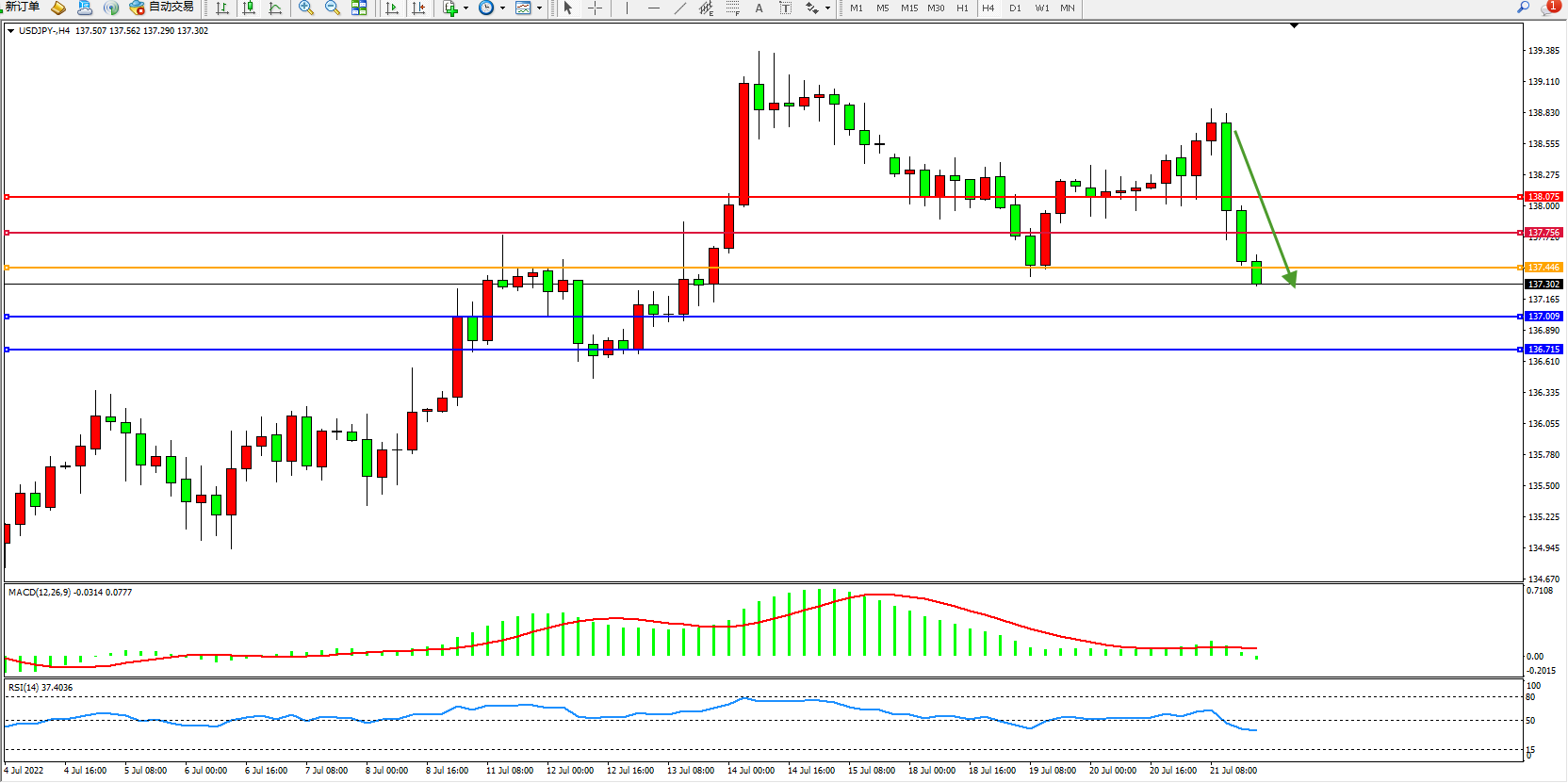交易策略:137.446下方看跌,目标137.009、136.715