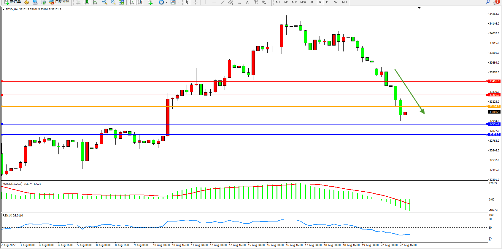道琼斯指数DJ30——4小时K线图显示: