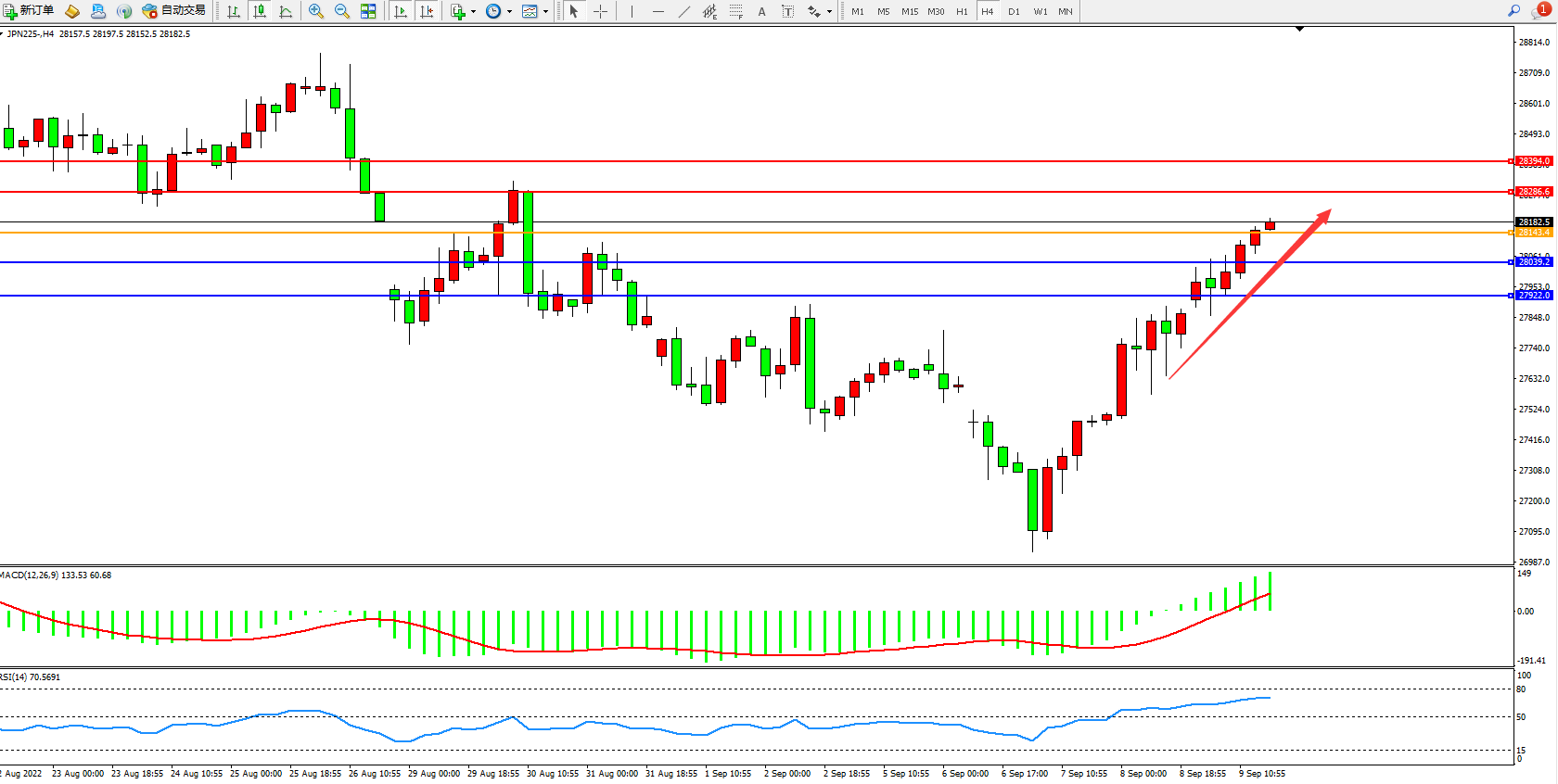 日经指数JPN225——4小时K线图显示: