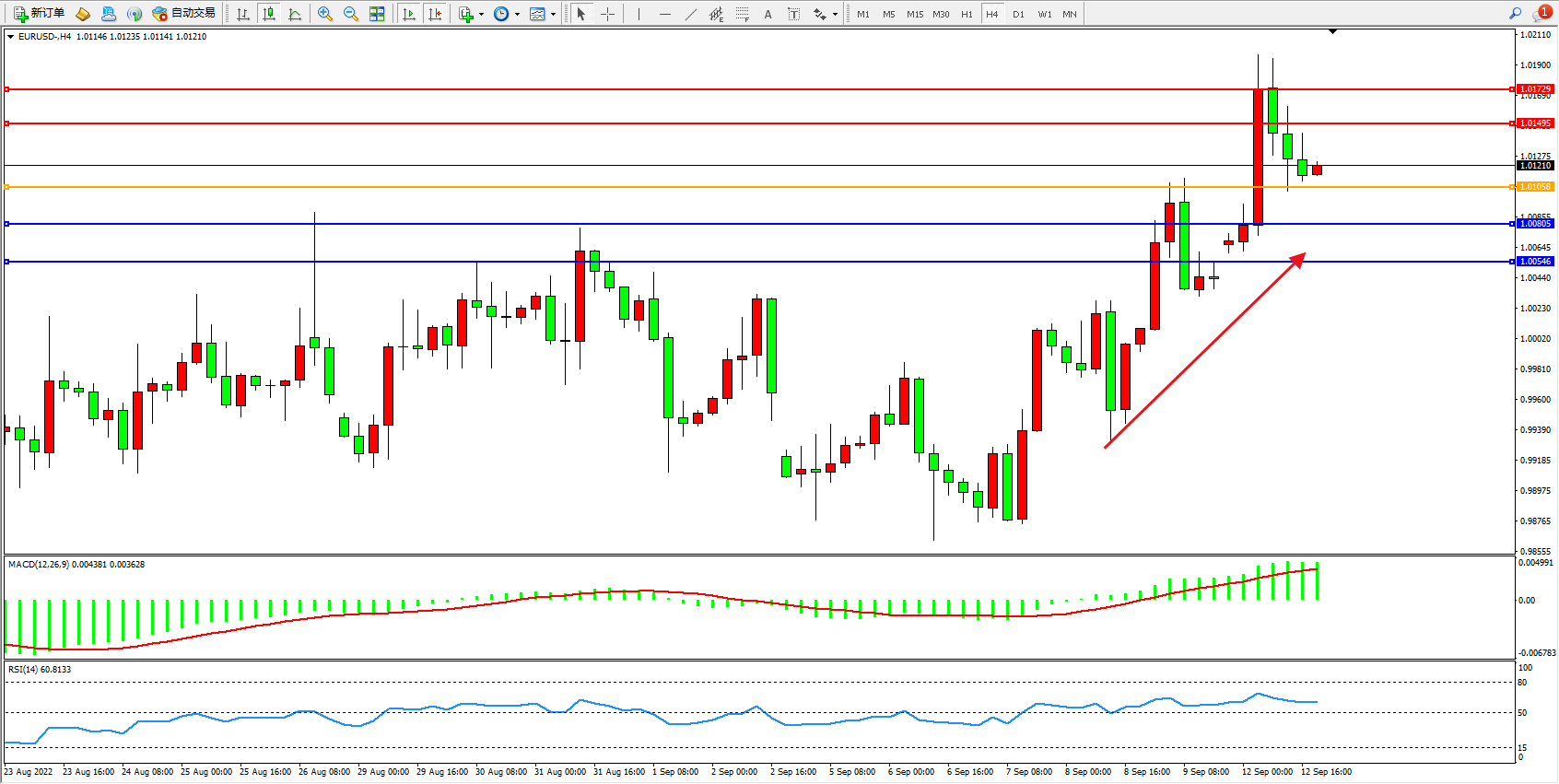 欧元美元EURUSD—4小时K线图显示: