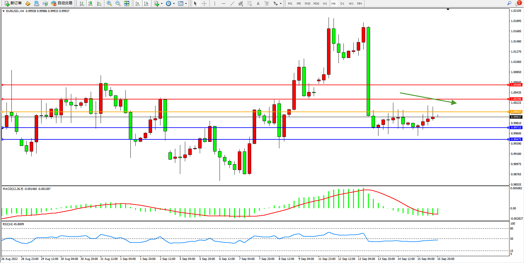 欧元美元EURUSD—4小时K线图显示: