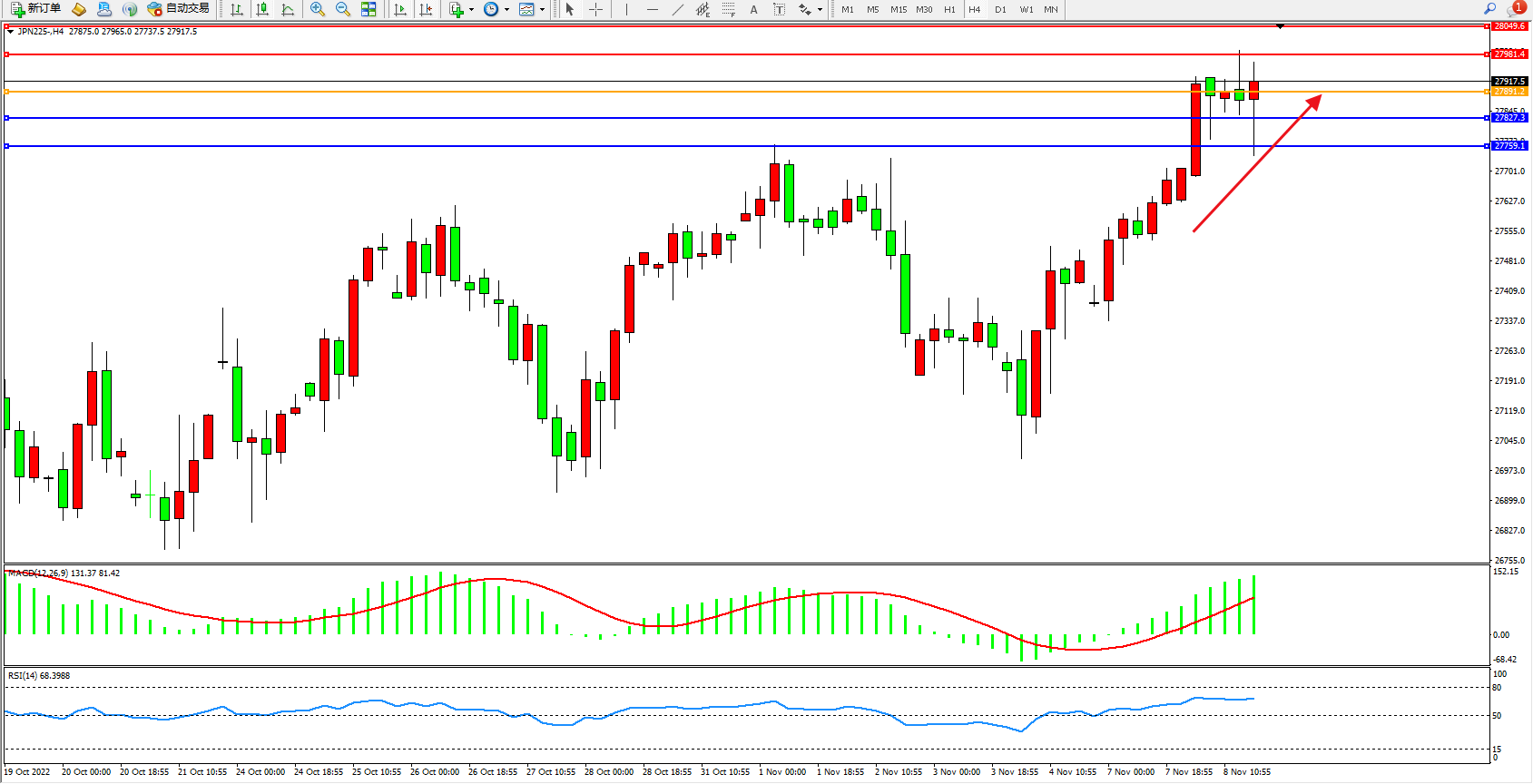 日经指数JPN225——4小时K线图显示:
