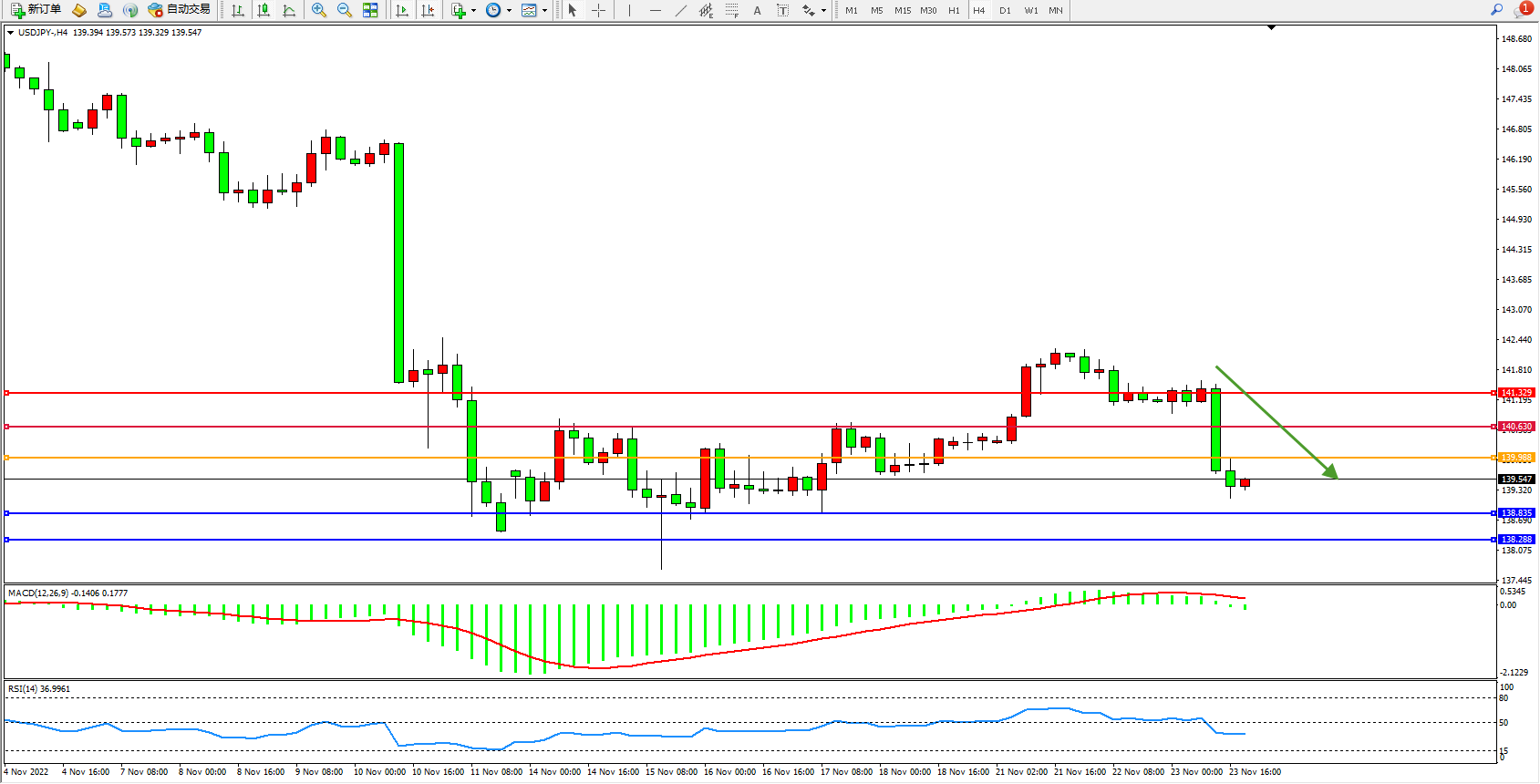 交易策略:139.988下方看跌,目标138.835、138.288