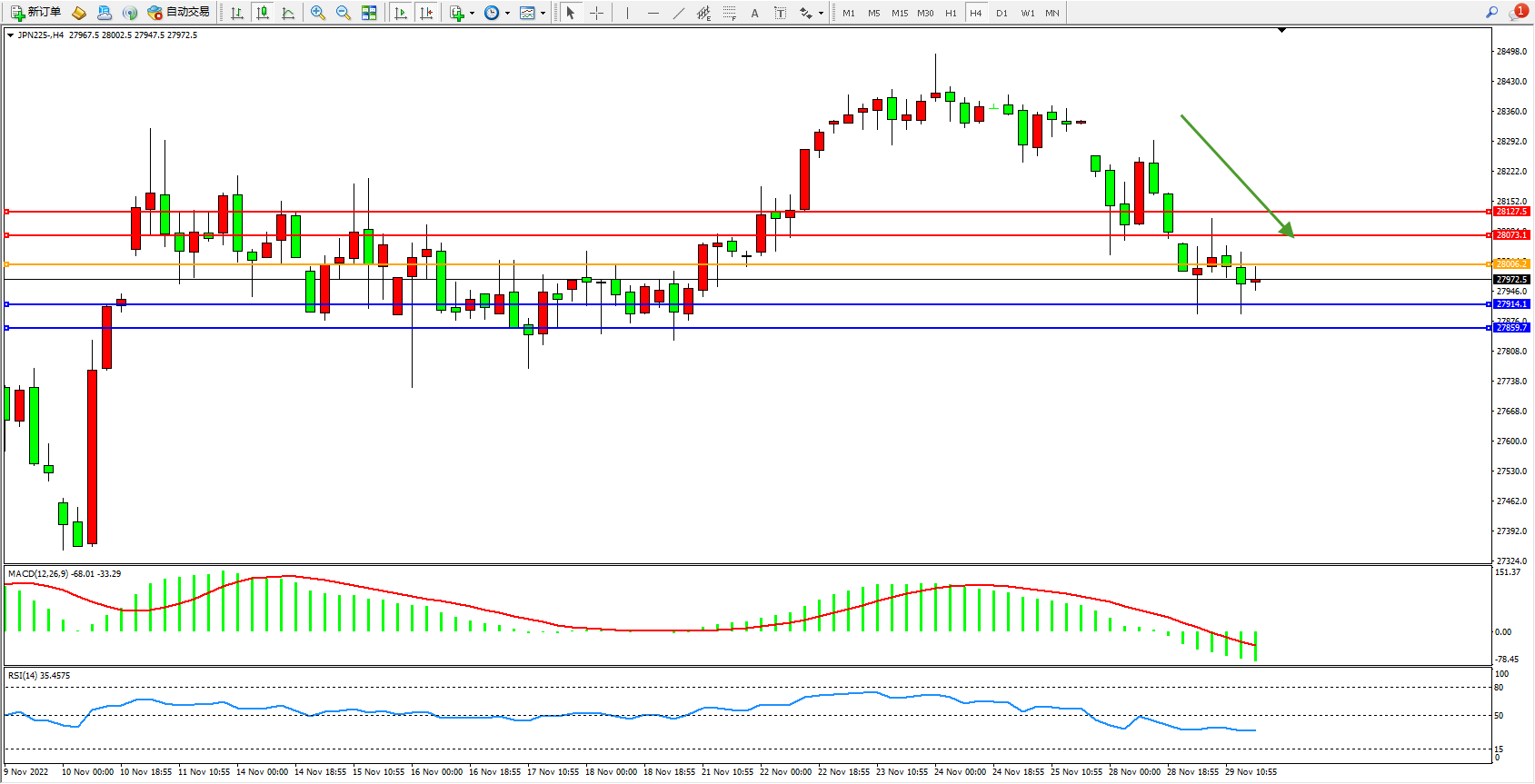 日经指数JPN225——4小时K线图显示:
