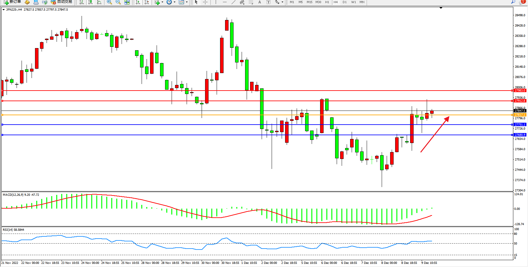 日经指数JPN225——4小时K线图显示: