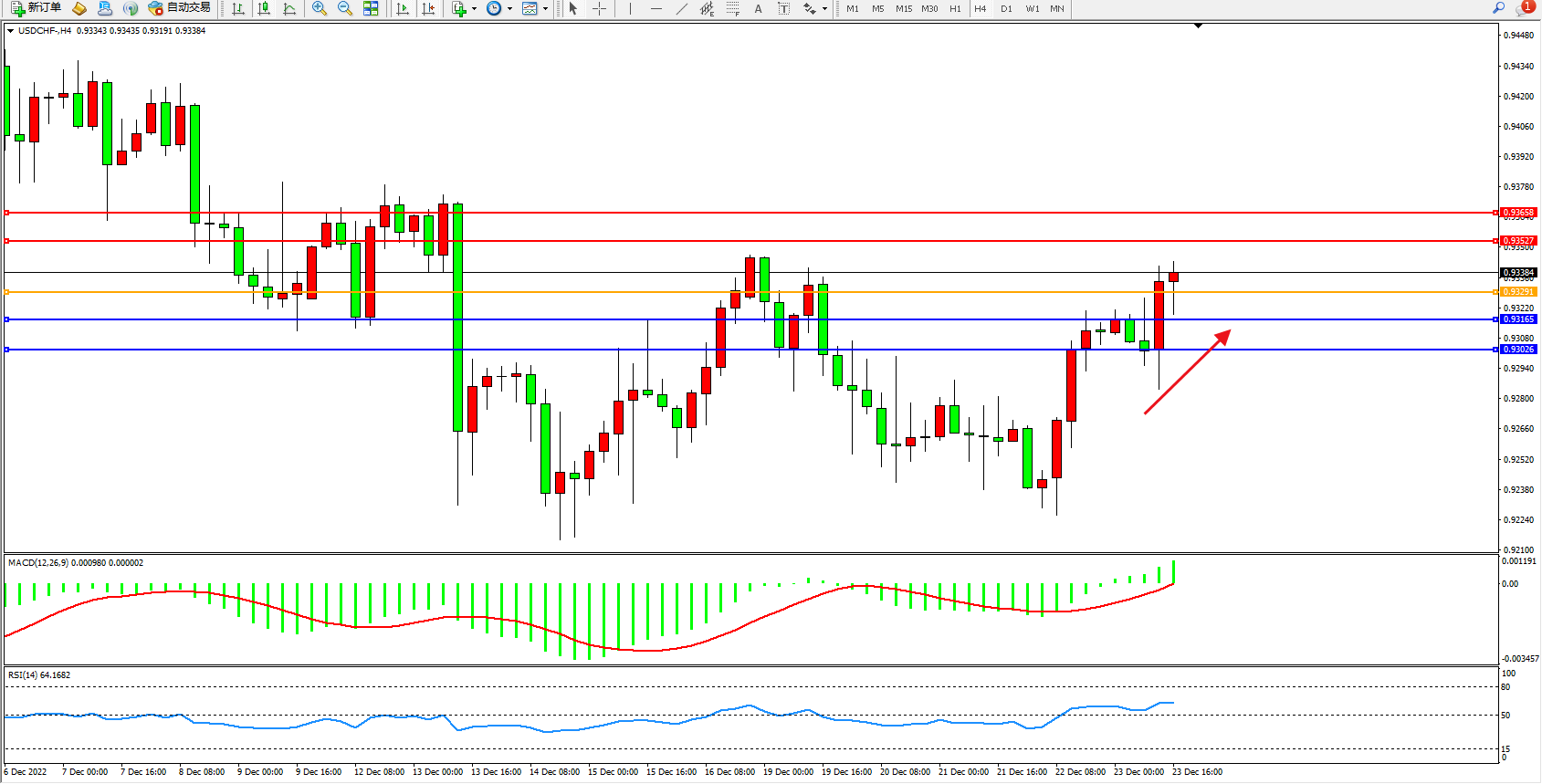美元兑瑞郎维持0.93384附近震荡,由于美联储的加息幅度可能超过市场预期,鹰派的美联储应该会支撑美元。美联储加息的幅度可能会超出金融市场的预期,而且收紧的力度确实会超过许多其他央行。周一圣诞节休市一日。