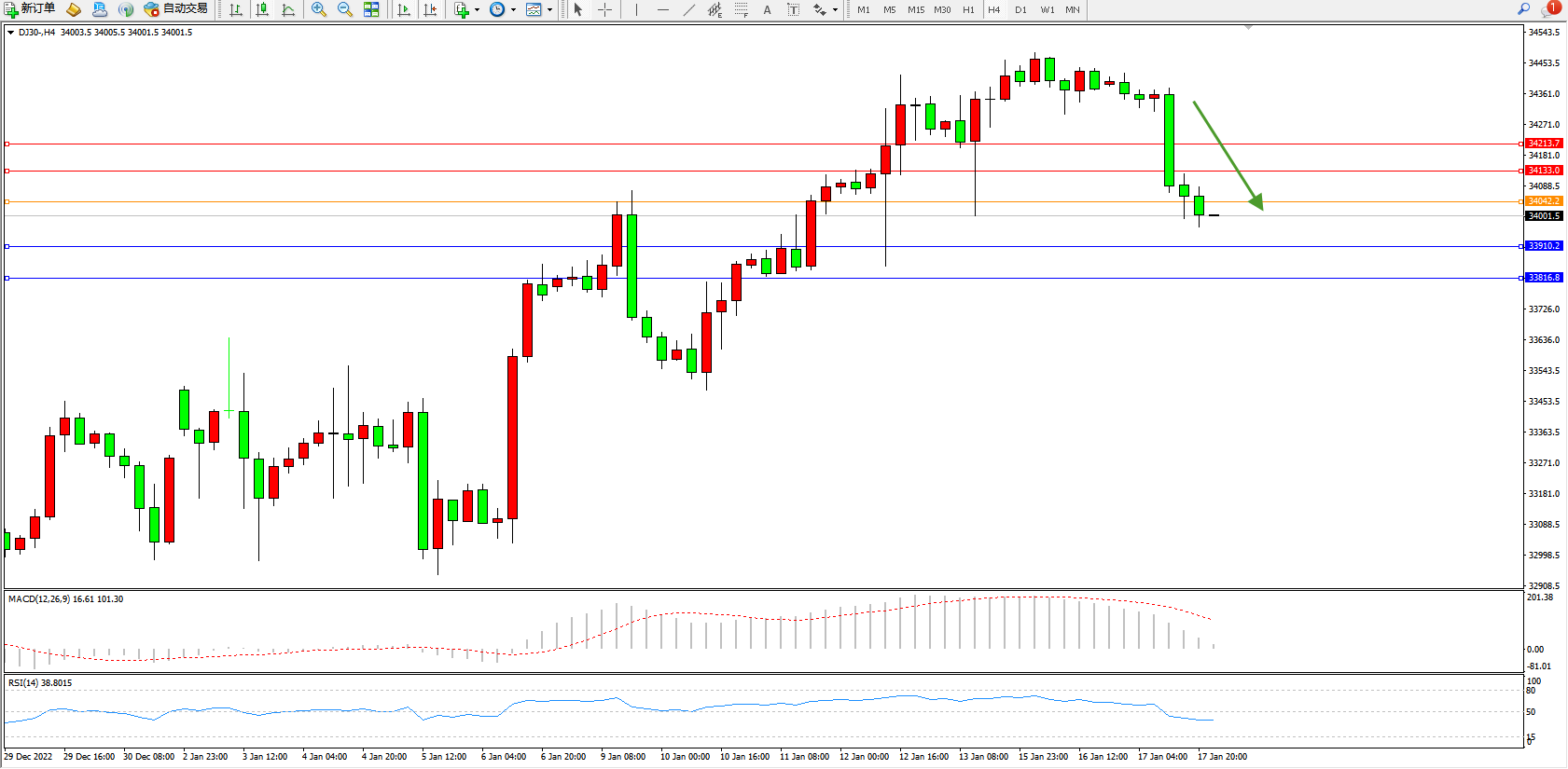 道琼斯指数DJ30——4小时K线图显示:
