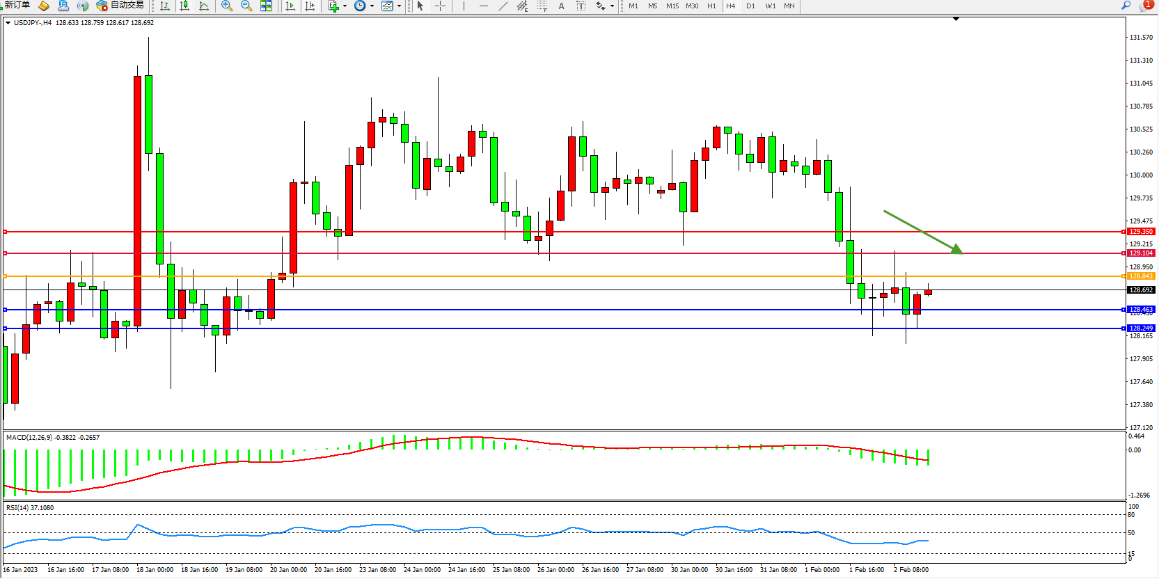 交易策略:128.843下方看跌,目标128.463、128.249