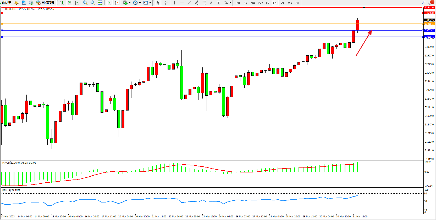 道琼斯指数DJ30——4小时K线图显示: