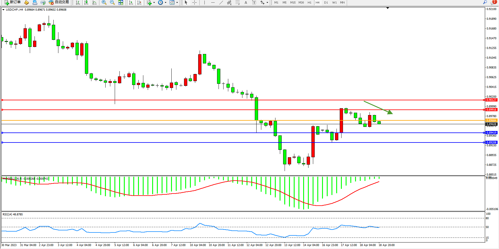 美元瑞郎USDCHF——4小时K线图显示:
