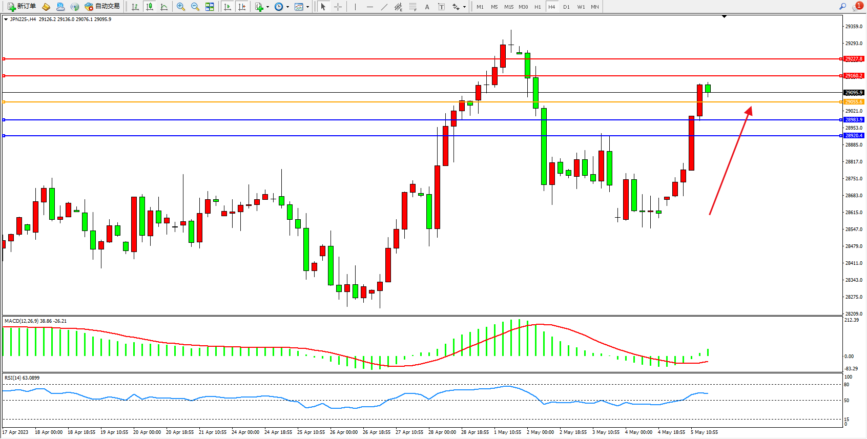日经225指数5月1日(周一)收盘上涨278.06点,涨幅0.96%,报29134.50点。经过几天休市,日经强势拉升,韩日正就韩国总统尹锡悦和日本首相岸田文雄7日在首尔龙山总统府会晤的事宜进行最终协调沟通。双方正在讨论明日同步公布岸田文雄访韩和韩日首脑会谈日程的方案。