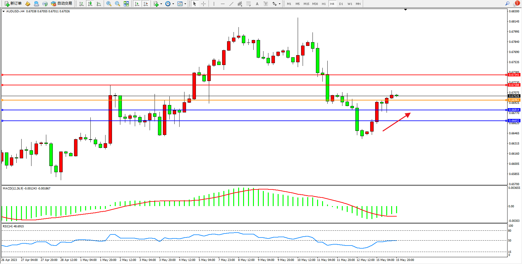 交易策略:0.66961上方看涨,目标0.67188 0.67341