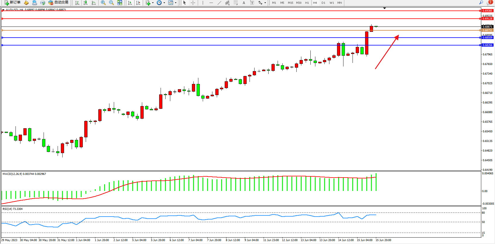 交易策略:0.68751上方看涨,目标0.69128 0.69385