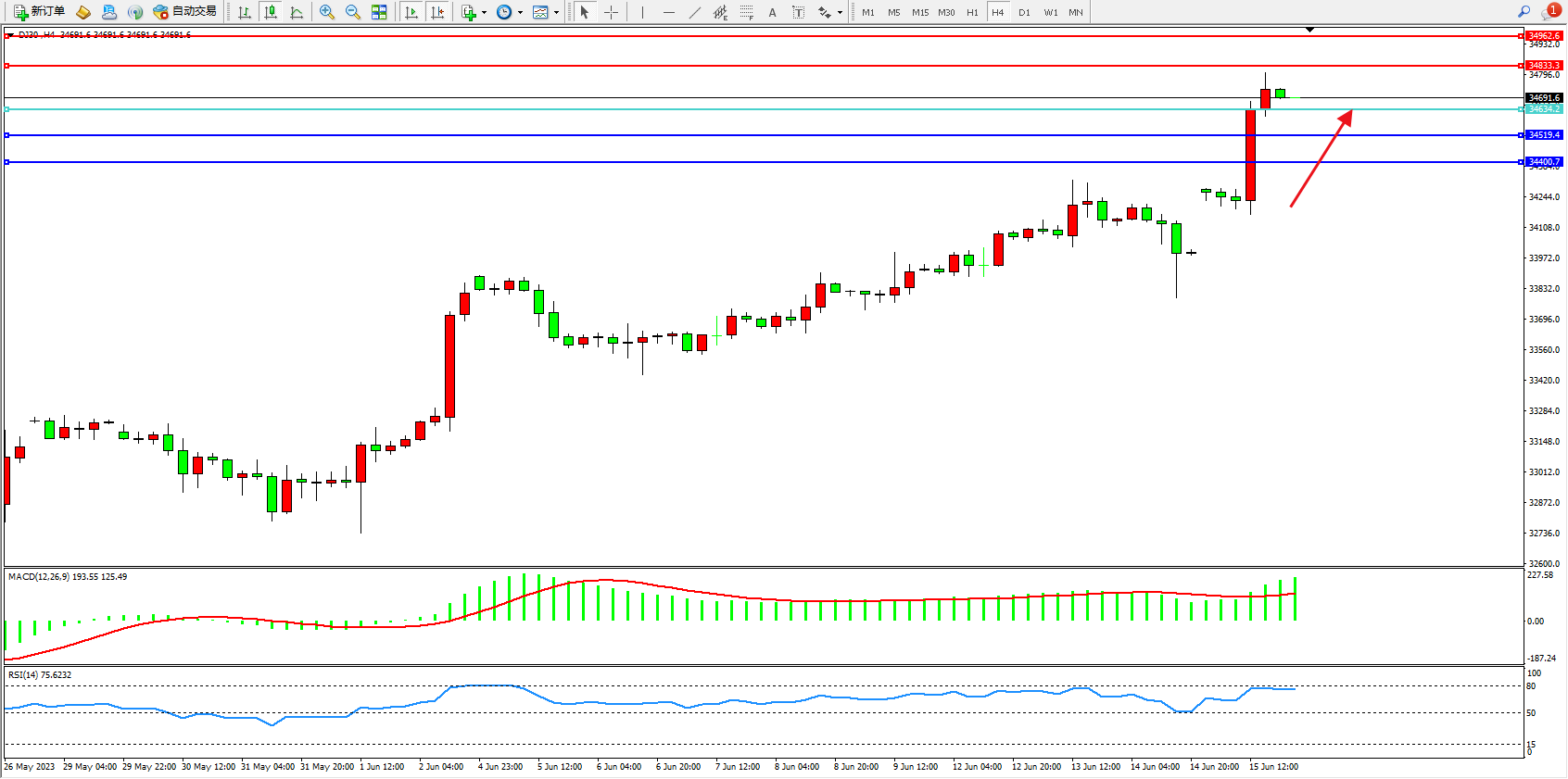 道琼斯指数DJ30——4小时K线图显示: