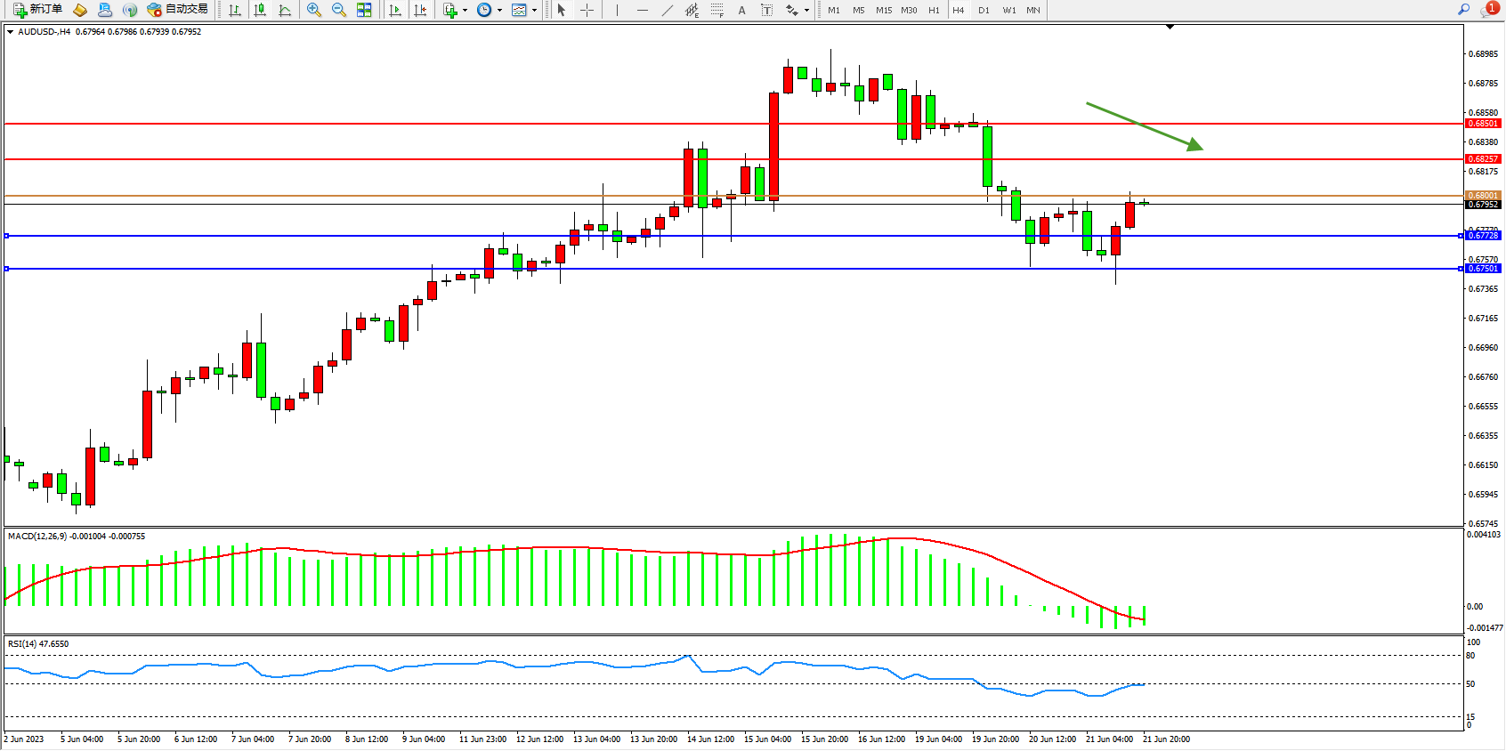 备选策略:0.68001上方看涨,目标0.68257 0.68501