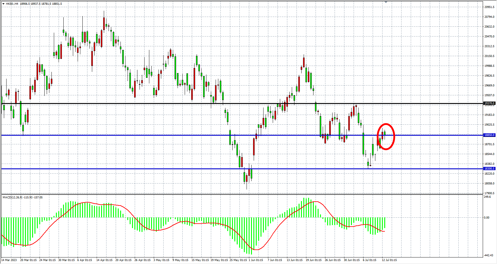 4小时图看,恒指在18850附近震荡,MACD量能零轴下有所缩量,趋势虽有反弹但力度不足,阻力关注18850附近,该位下继续看跌18300-18000。