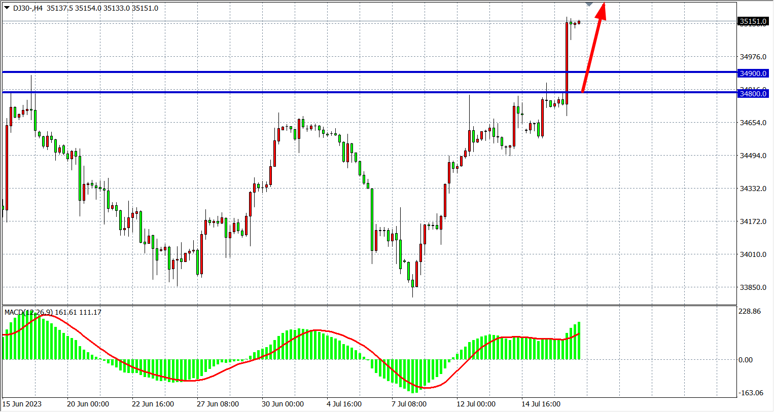 4小时图看,道指在进一步突破34800走高,MACD量能维持零轴上放量,多头趋势加速,支撑上移34800-34900附近,阻力35300-35600。