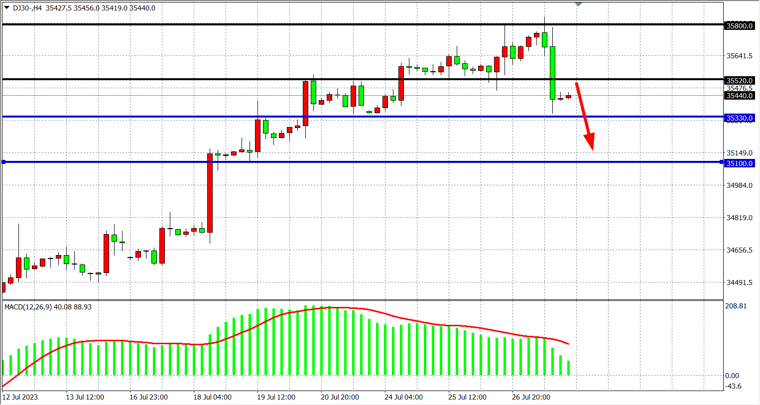 4小时图看,道指在高位35800一线受阻回落,跌至35450附近,MACD量能在零轴上缩量,趋势有转弱迹象,支撑关注35330-35100附近,阻力35520-36000。