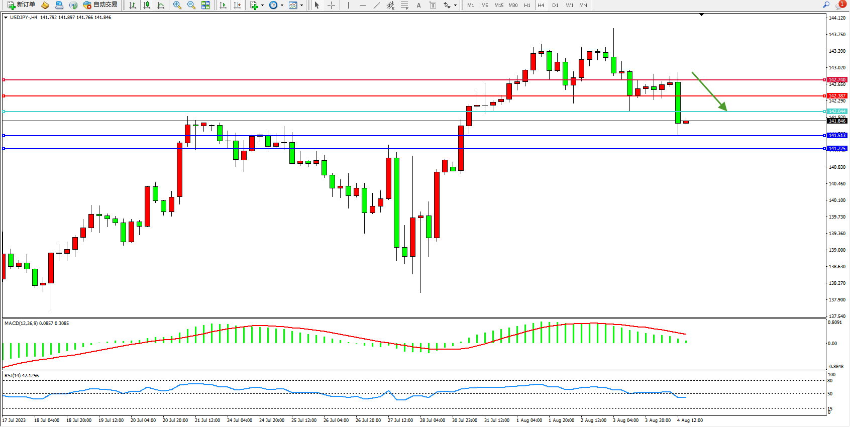 交易策略:142.044下方看跌,目标141.513  141.225