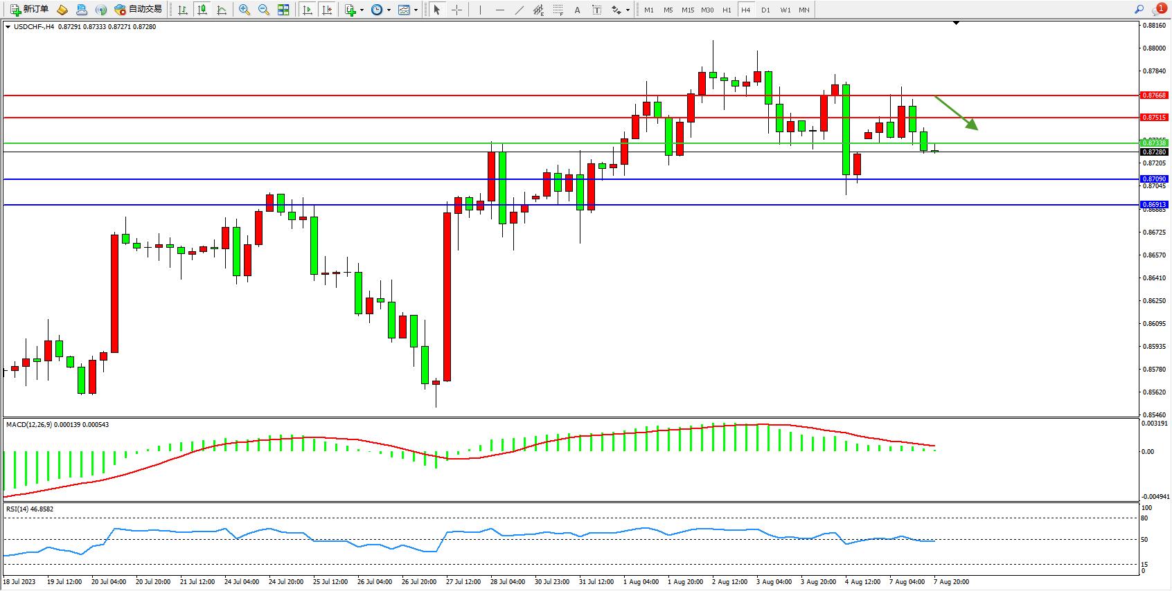 美元瑞郎USDCHF——4小时K线图显示: